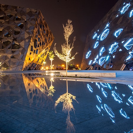 يتكون مركز الشيخ جابر الأحمد الثقافي من أربعة مبانٍ يغطيها هيكل فولاذي غُلف بقشرة من التيتانيوم والزجاج تلتقط الضوء ثم تعكسه، فتتلألأ وتبدو كجواهر لامعة تحتويها حديقة عامة أكبر حجمًا. تخلق الأشكال الهندسية المعقدة المستوحاة من العمارة الإسلامية قشرة خارجية غنية التركيب لكل مبنى، وينتج عن ذلك مساحات عامة رائعة أسفلها، تستفيد من تفاعل الضوء والظل. أما المباني الفخمة الواقعة داخل القشرة الخارجية فإنها تضفي طابعا مميزًا ومثيرًا للاهتمام والترقب. وتستمر مفاجآت التصميم في كل مبنى، حيث يجد الزوار جواهر متداخلة عند استكشافهم للمساحات الداخلية الرائعة. كما تتميز أروقة بهو مباني المركز بفنون الخط المزخرفة، فهناك أكثر من 8000 مترًا مربعًا من الخط العربي، تتوزع على الأجنحة الأربعة على الحوائط الخارجية للمسارح، والقاعات، والمكتبات.